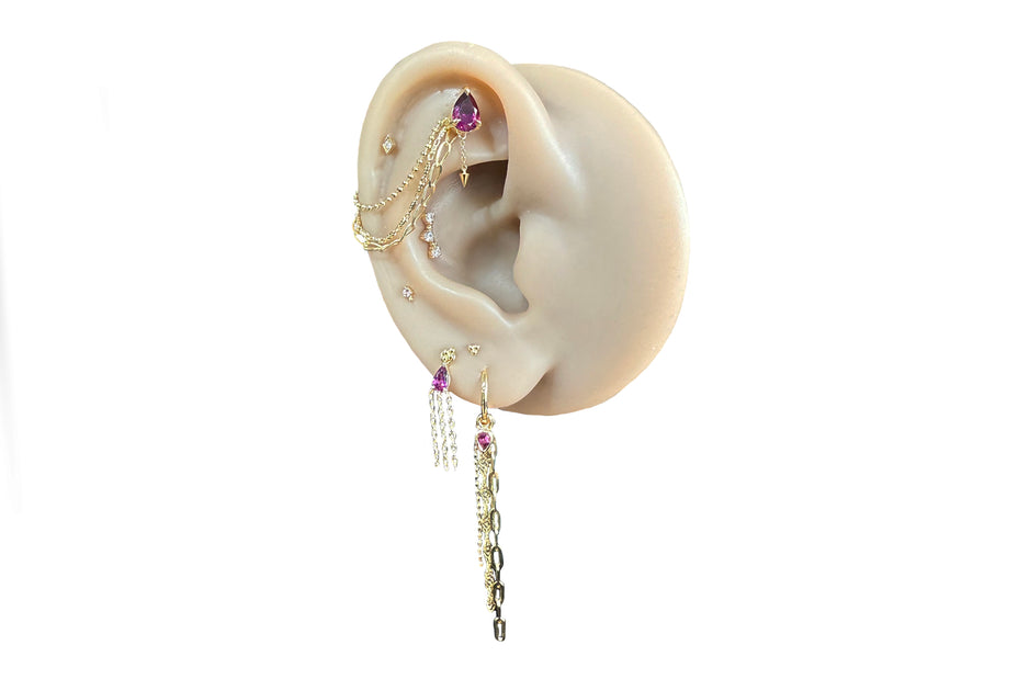 In deze styling staat structuur en kleur centraal. Je vind verschillende schakels terug in de kettingen en bedels en in de afwerking van de piercing topjes. Een gebalanceerde toevoeging van kleur met Rhodolite en een Colour changing Garnet maar ook Diamant en Swarovski zirconia's. De kettingen en bedels zorgen voor veel beweging en maken een mysterieuze look.